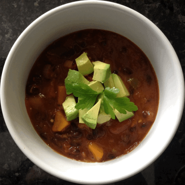 Directions1 chopped red onion2 bell peppers, chopped1 small butternut squash, peeled (good luck!) and chopped4 cloves of garlic, minced2 tablespoons of olive oilpinch of ground sea salt1 tablespoon chilli powder1 teaspoon ground cumin1/2 - 1 tbsp chopped chipotle in abode (this stuff is SPICY - don’t be brave!!)1 bay leaf1/4 teaspoon ground cinnamon1 can organic diced tomatoes (I used a 28oz. can); use half of the juices2 cans of organic black beans, rinsed and drained2 cups vegetable broth2 Avocados, sliced