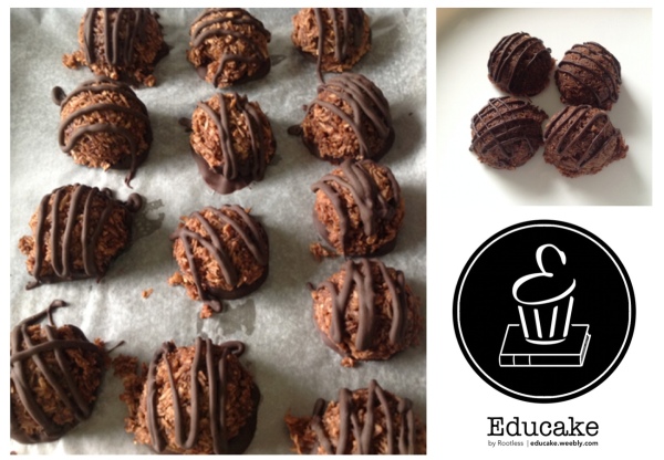 Melt the chocolate chips in a double-boiler and dip the macaroons (or if they keep falling apart, place a dollop of chocolate on the bottom of the macaroons) and place on a plate lined with wax paper. Use any excess chocolate to drizzle on top of the macaroons.